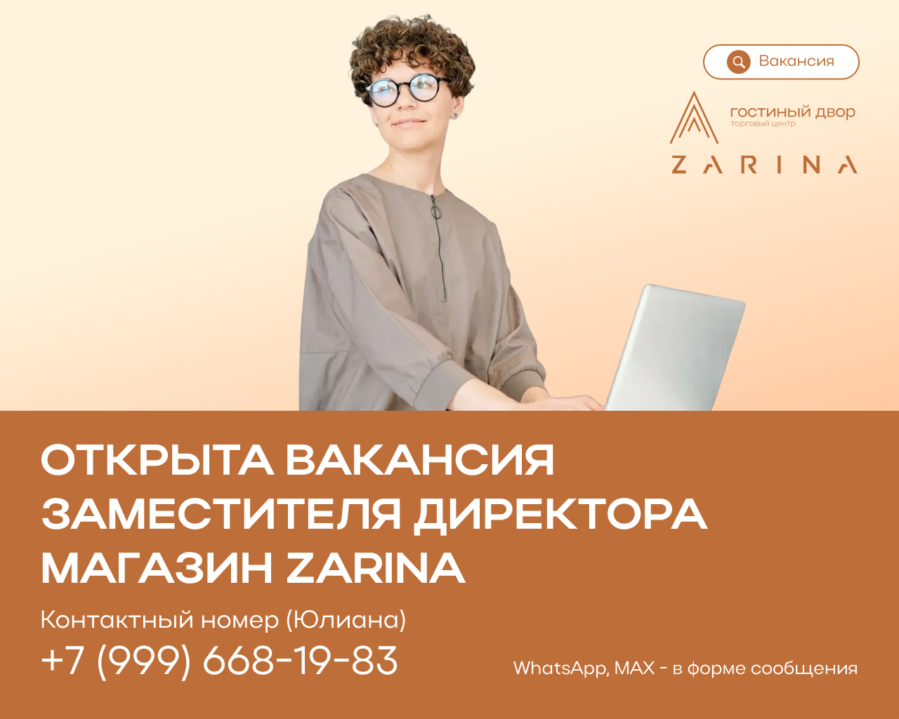 Если вакансия полностью для вас подходит или же у вас остались вопросы, вы можете смело откликнуться в формате сообщения в Telegram или MAX по контактному номеру телефона: +79996681983 – Юлиана.